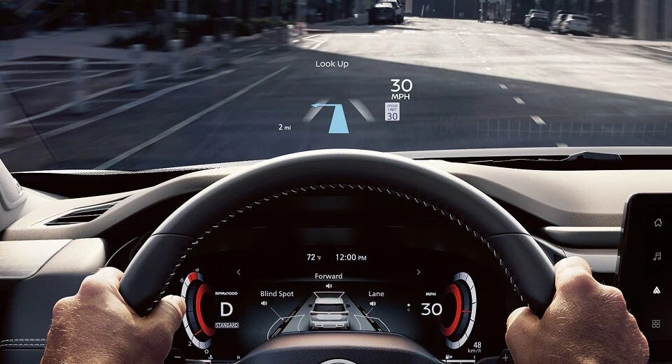 La información esencial está en primer plano. Para una conducción más segura y con menos distracciones, la pantalla Head-Up Display disponible proyecta información clave, como indicaciones paso a paso, velocidad y estado de ProPILOT Assist, directamente en tu línea de visión. [[1022]] [[1023]] [[1042]]