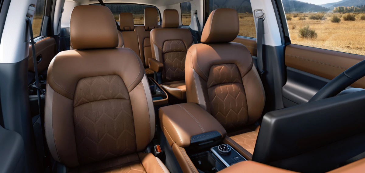 Nissan Pathfinder® Platinum 2026. Los asientos tapizados en cuero semianilina color castaño disponibles brindan comodidad duradera para usted y su tripulación, kilómetro tras kilómetro.